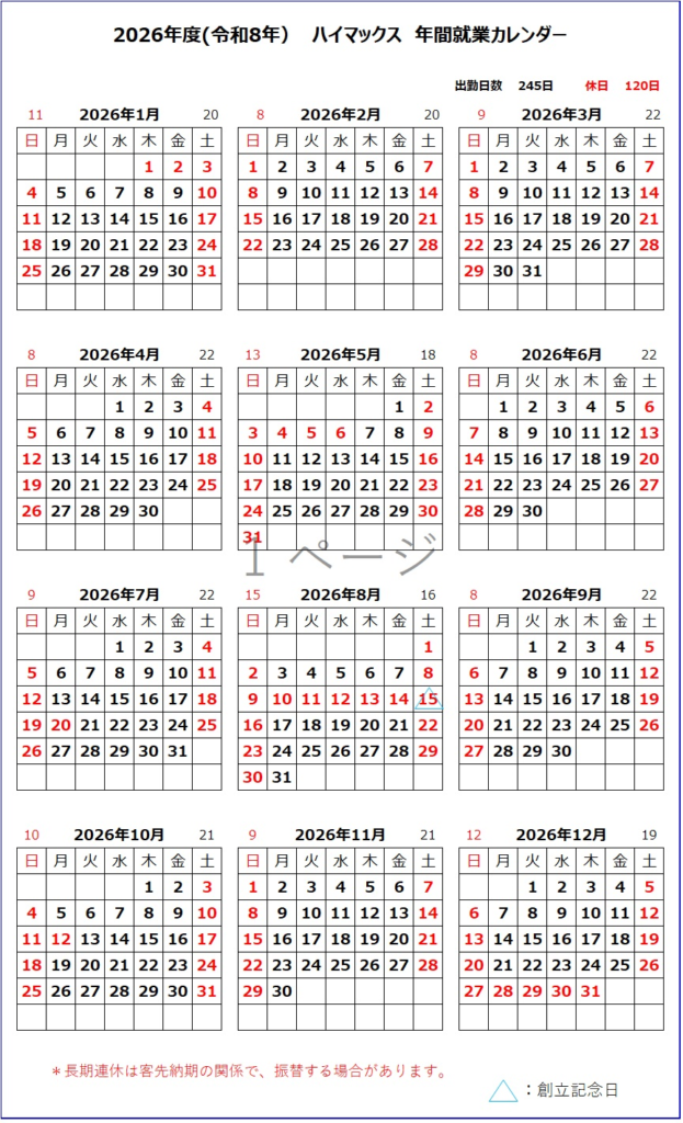 2026.03.26 お知らせ 2026年カレンダー こんにちは!有限会社ハイマックスです。 2026年(令和8年)の営業カレンダーを掲載しました! 今年も一つひとつ丁寧に、ものづくりに取り組んでまいります! 引き続きよろしくお願いいたします✨